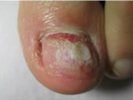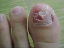 患者自述:记忆中很小的时候家里卫生条件不好,鞋子也破破烂烂的,很小的时候就开始长灰指甲,一开始不怎么严重,就是指甲有点发黄,试过很多偏方,比如用陈醋泡,用大蒜汁涂抹等等,都不是很有效。大学后灰指甲已经非常严重了,夏天再热也不敢穿凉鞋和拖鞋,也在药店买过亮甲和口服治疗灰指甲的药物,有效果但是没能坚持,一直发展成现在这样。