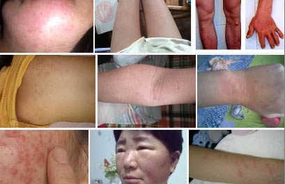 20%的人有皮肤过敏现象。症状是发痒,同时也可能会伴有红肿干屑、水泡,或病灶结痂及渗出液化等症状:这些病灶的形状与大小各有不同。治疗不及时容易发展成为慢性皮肤病,如皮炎、荨麻疹、湿疹等。